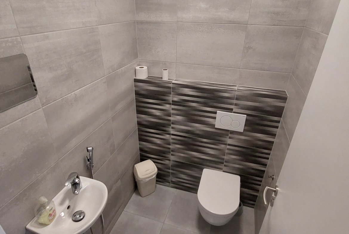 V obytných místnostech je plovoucí podlaha, v koupelně a WC je keramická dlažba.