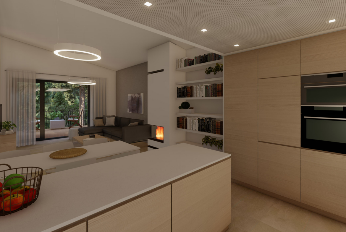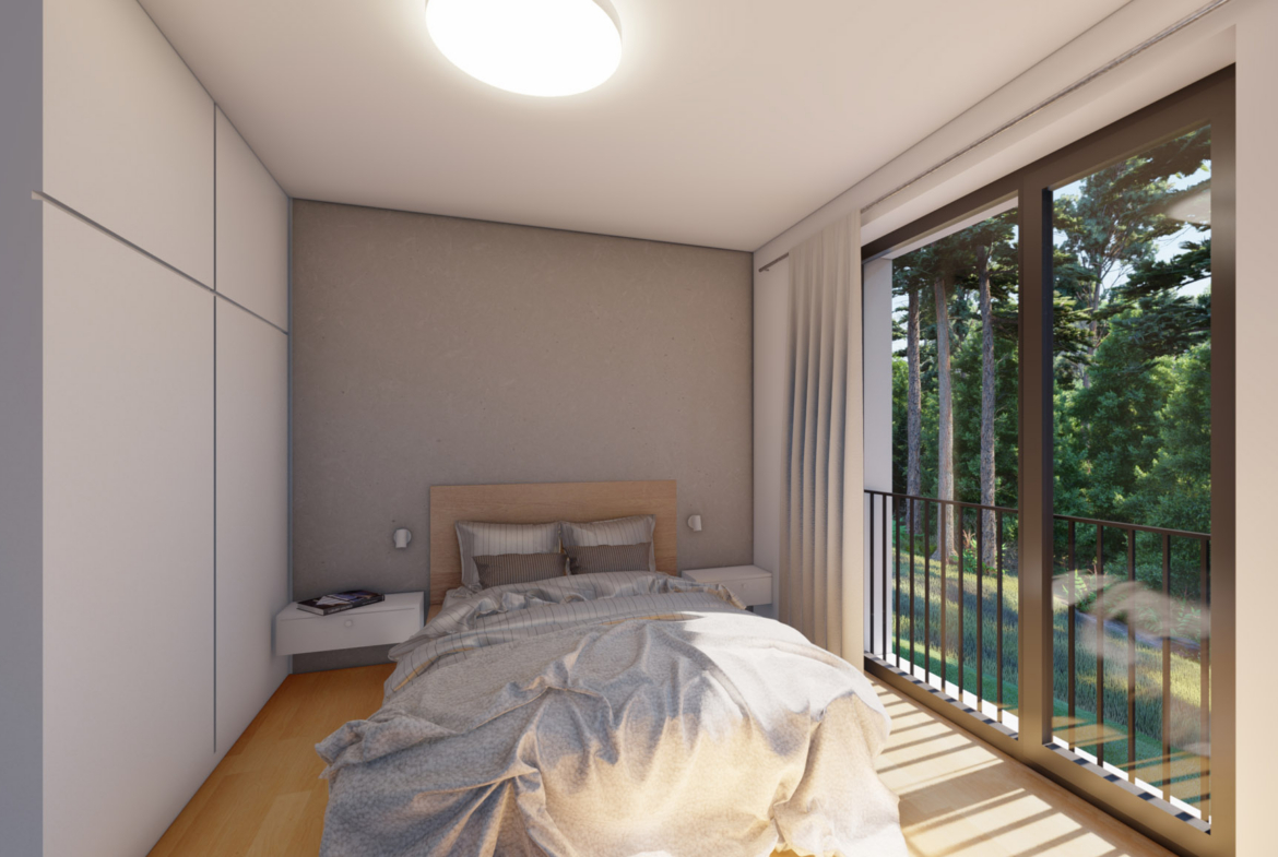 1. podzemní podlaží (1. P.P): dvě ložnice s vlastními šatnami, koupelna s WC a další terasa orientovaná na jihovýchod do zahrady s výhledem na les.
