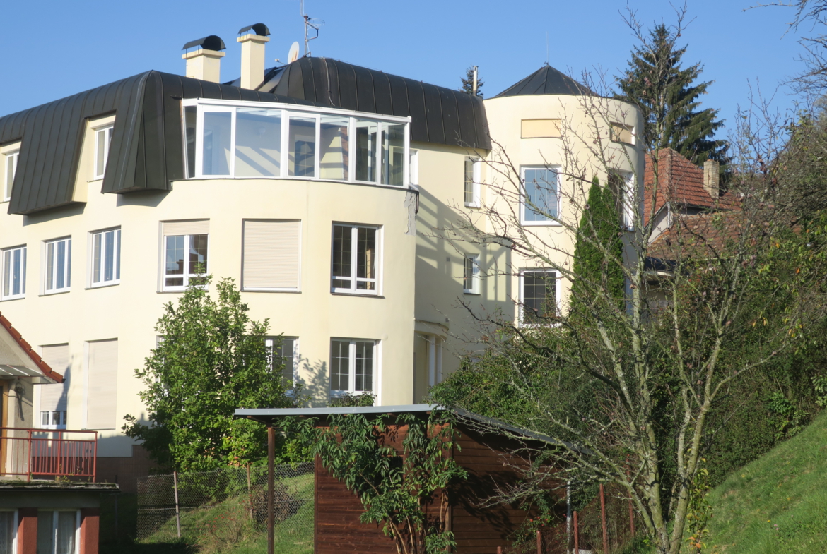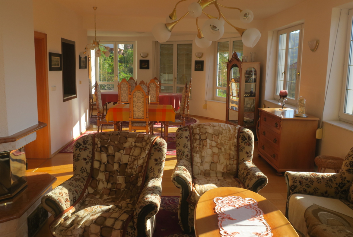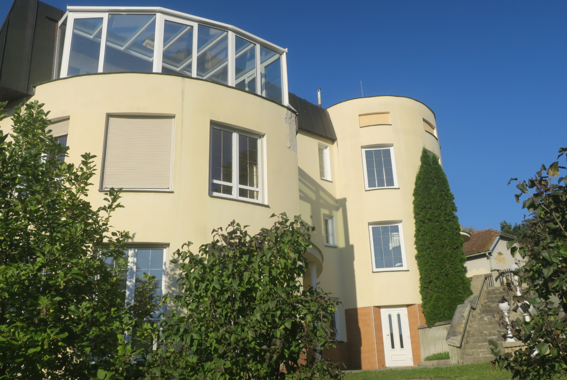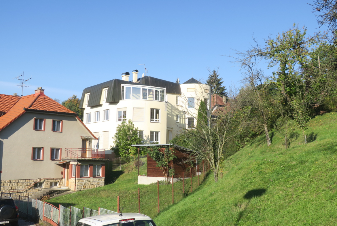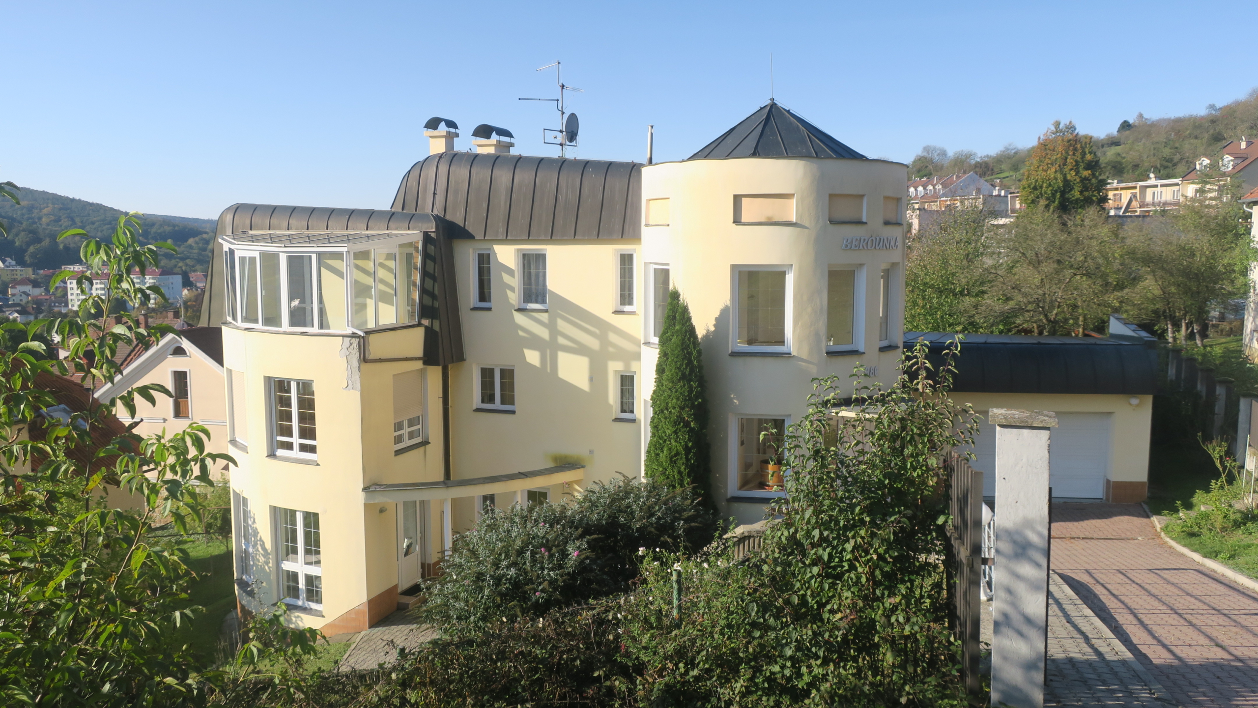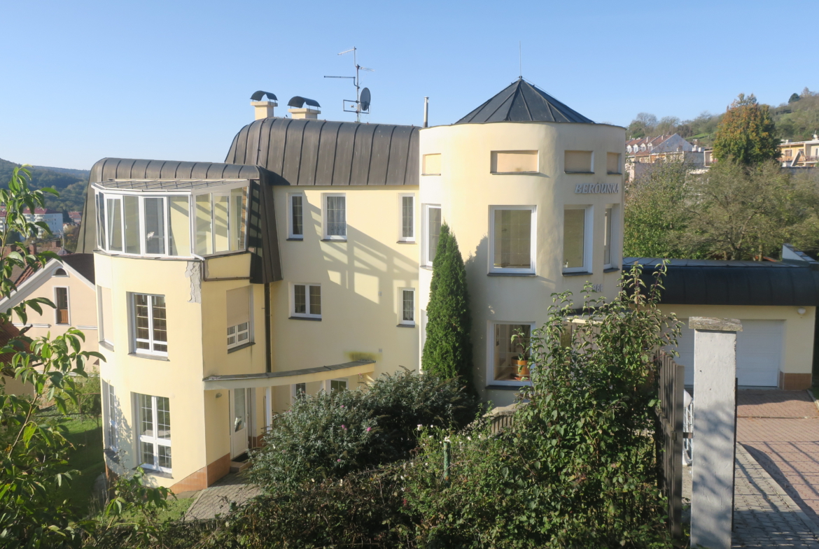 Nabízíme k prodeji vilu Berounku ve vyhledávané lokalitě ul. Slunná v Luhačovicích. Vila je postavena na klidném a slunném místě s krásným výhledem do lázní a okolí, pěší chůzí vzdálena od centra 5-10 minut. Nemovitost je třípodlažní s celkovou užitnou plochou cca 496 m2. V prvním nadzemním podlaží, které bylo užíváno manželským párem, se nachází vstupní hala s točitým schodištěm vedoucím do 2. NP a 1. PP. Z této haly se vstupními dveřmi vchází do chodby, ze které jsou vstupy do jednotlivých místností (prostorný obývací pokoj s výhledem, krbem a jídelnou, kuchyně se spížkou, ložnice s koupelnou a šatnou, samostatné WC s umyvadlem, menší obývací pokoj, který je propojen s velkým obývacím pokojem posuvnými dveřmi). Vstupní hala je také propojena chodbičkou s garáží pro 2 auta.