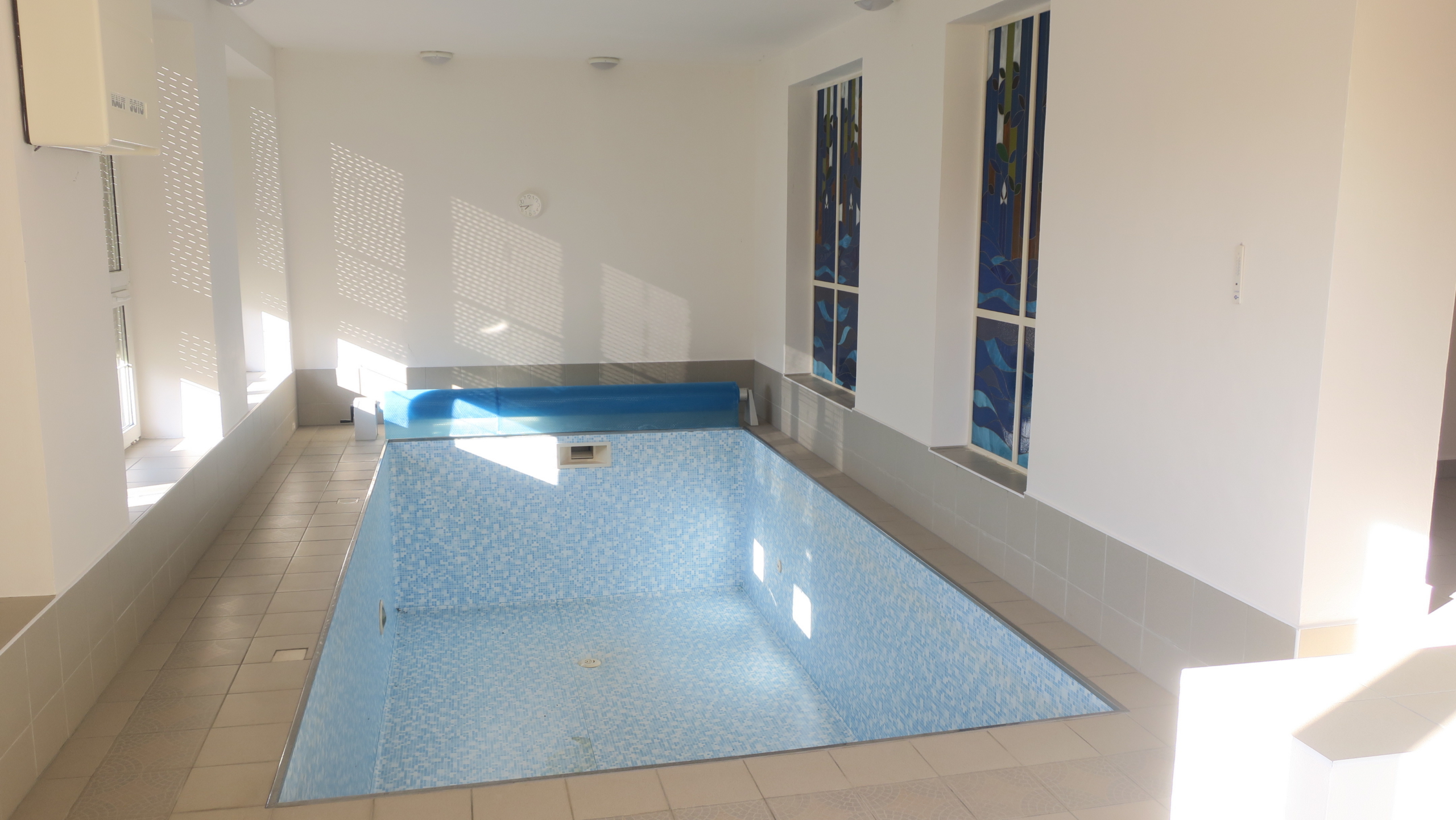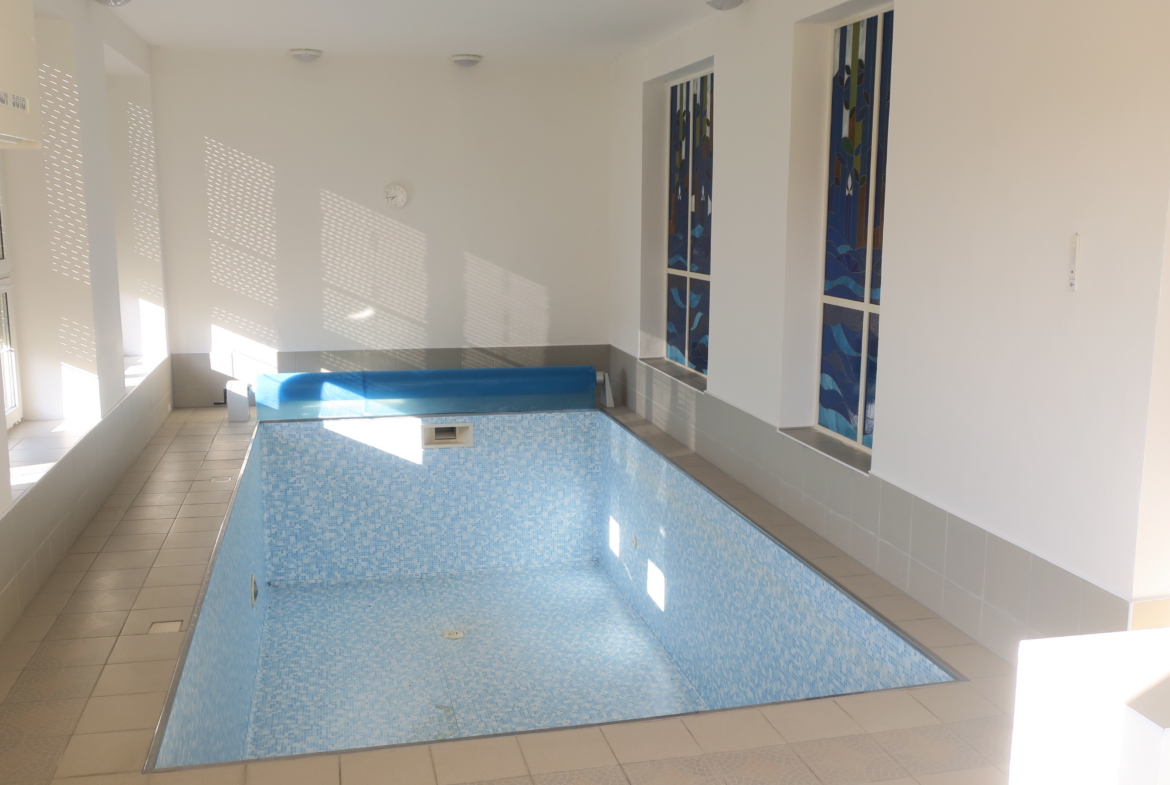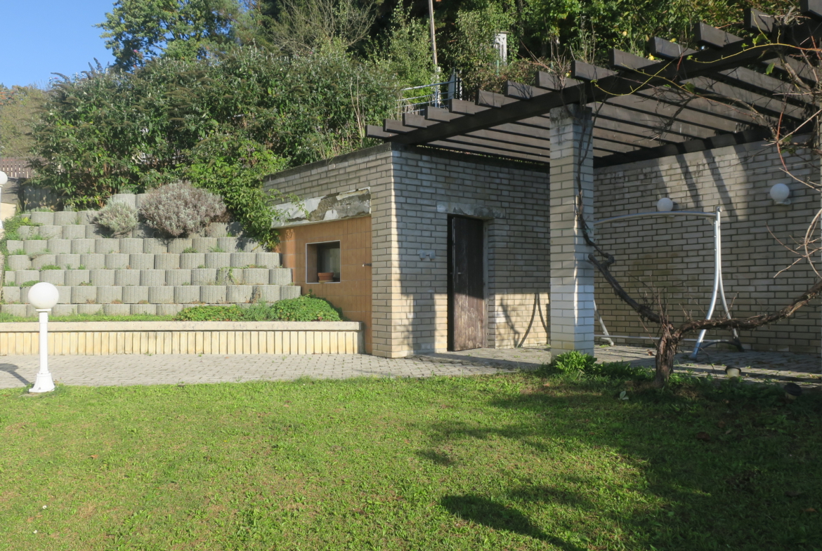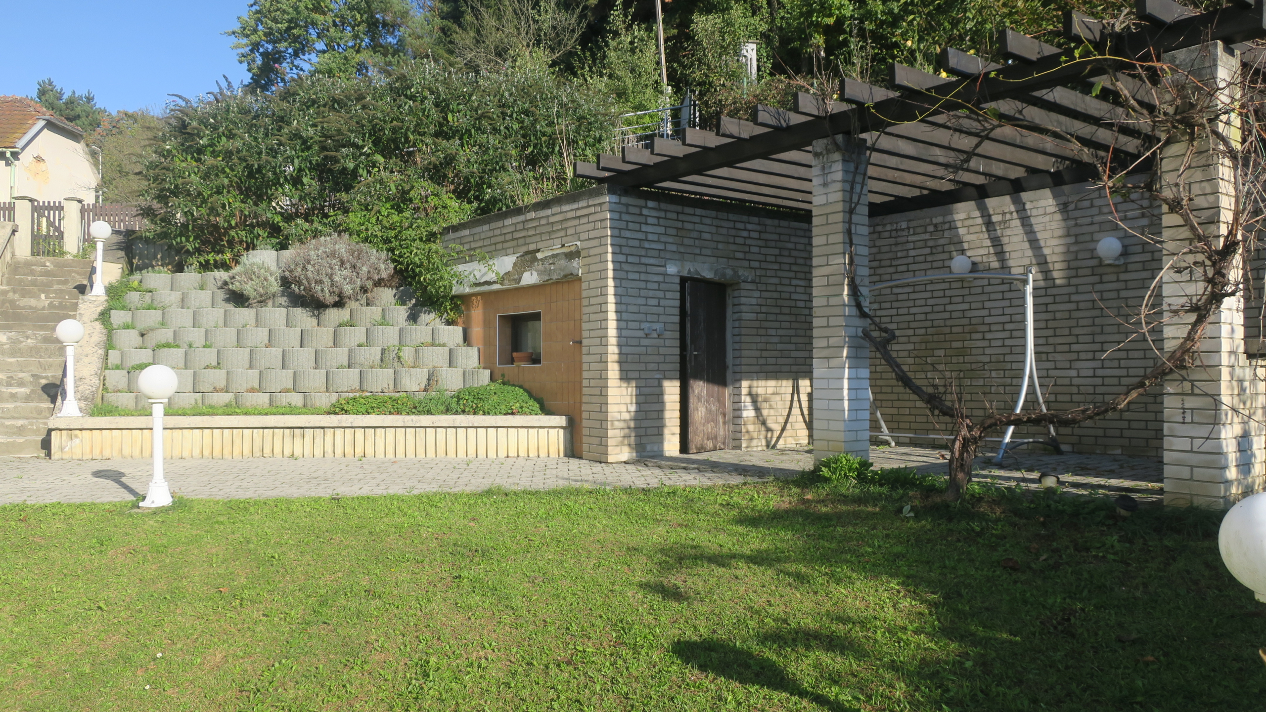 V prvním z části podzemním podlaží (dům je ve svahu) se pak nachází krytý bazén vyhřívaný solárními kolektory oddělený stěnou s mozaikou od převlékárny s koupelnou a WC, dále kotelna a technické místnosti, včetně sklípku s posezením. Ze sklípku, z chodby a bazénu jsou přímé vstupy na terasu a zahradu. Na konci terasy se nachází pergola s místností. Přívod vody do pergoly je toho času zastaven, venkovní kohoutek se nachází na fasádě domu na terase. Elektřina je do pergoly zavedena. Na pergole i v zahradě se nachází osvětlení.