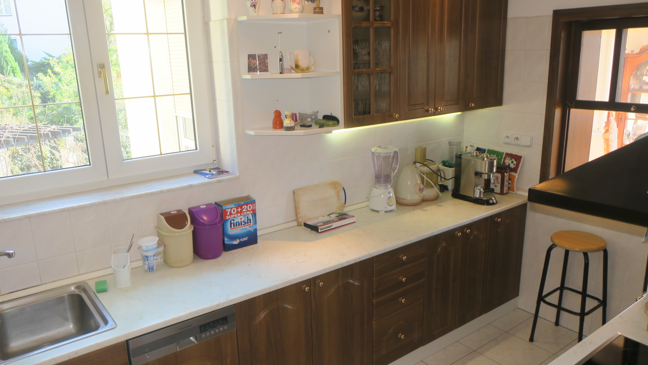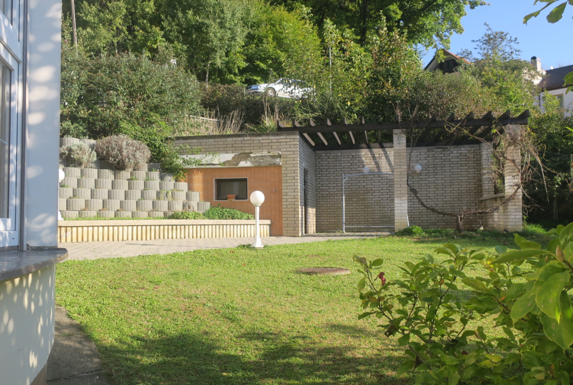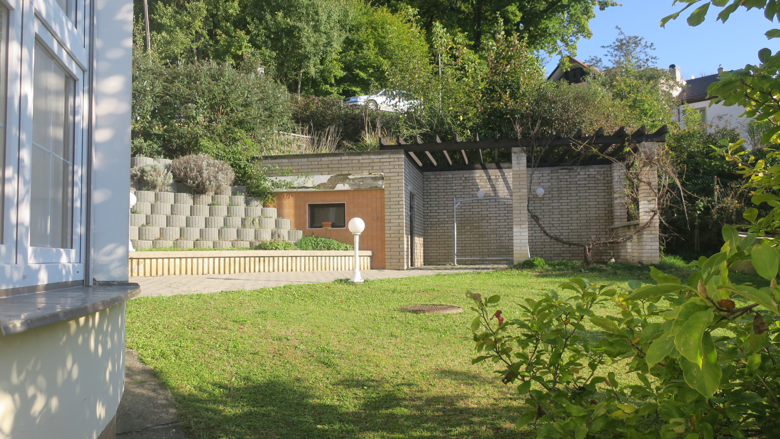 V prvním z části podzemním podlaží (dům je ve svahu) se pak nachází krytý bazén vyhřívaný solárními kolektory oddělený stěnou s mozaikou od převlékárny s koupelnou a WC, dále kotelna a technické místnosti, včetně sklípku s posezením. Ze sklípku, z chodby a bazénu jsou přímé vstupy na terasu a zahradu. Na konci terasy se nachází pergola s místností. Přívod vody do pergoly je toho času zastaven, venkovní kohoutek se nachází na fasádě domu na terase. Elektřina je do pergoly zavedena. Na pergole i v zahradě se nachází osvětlení.