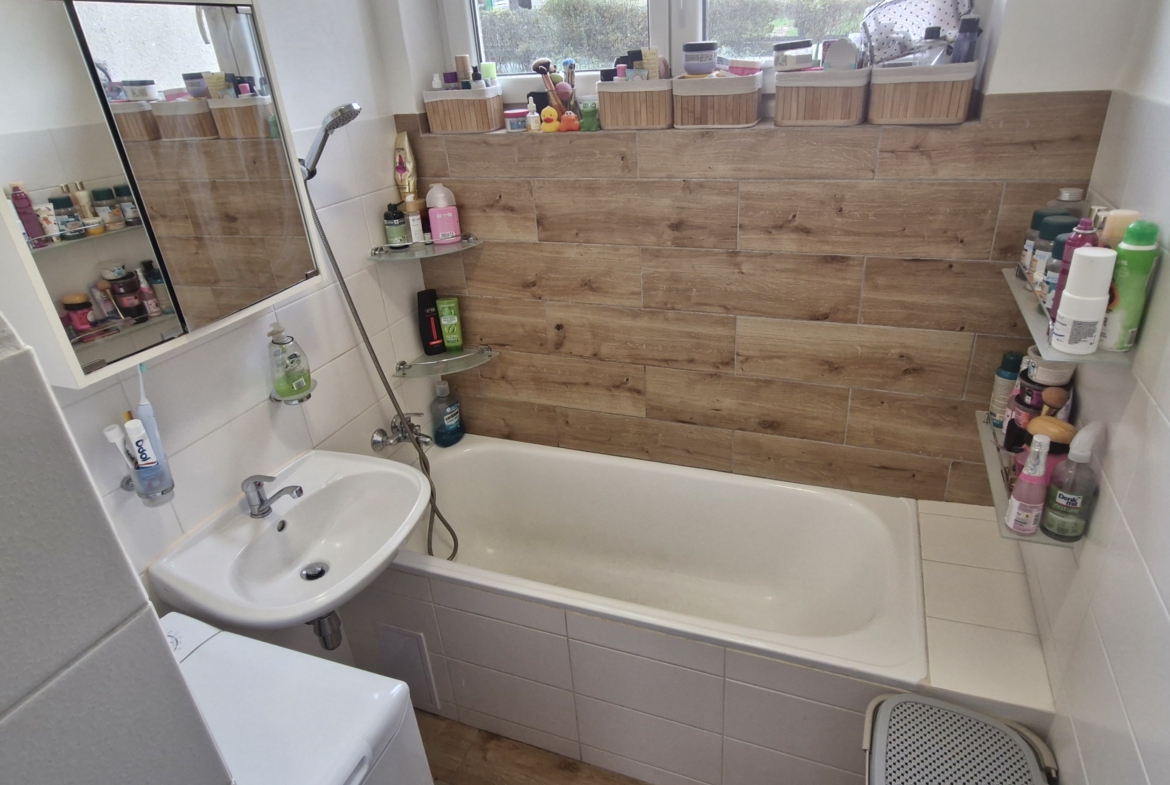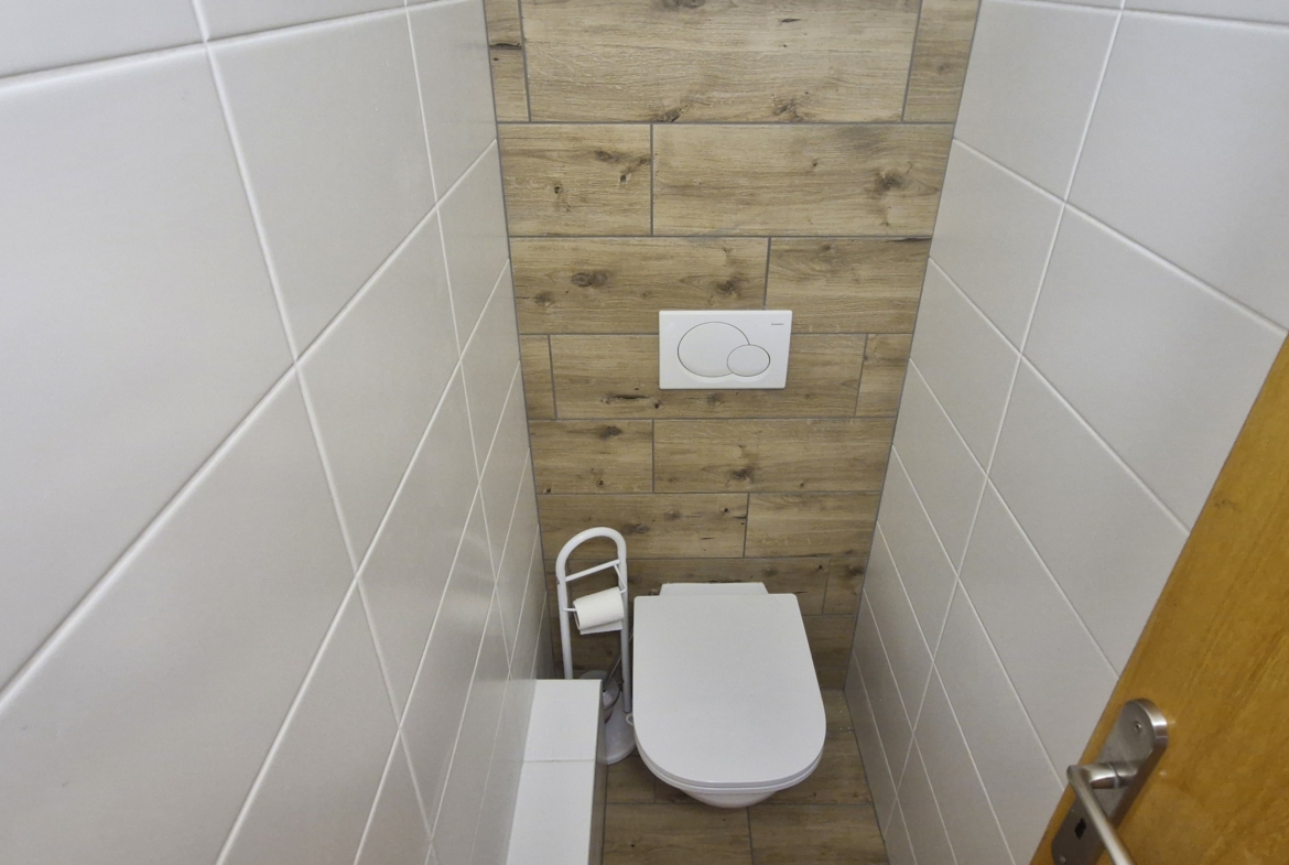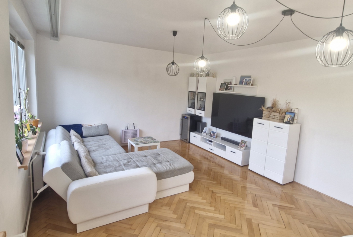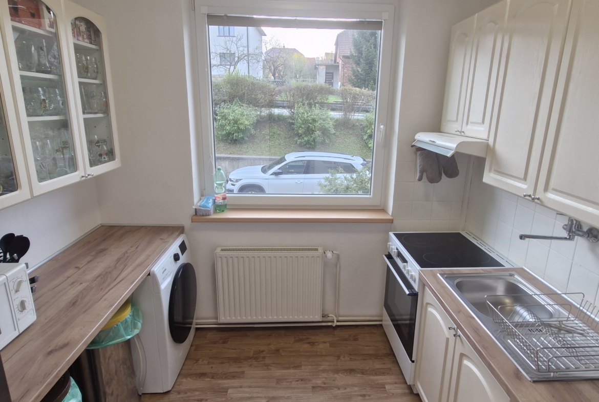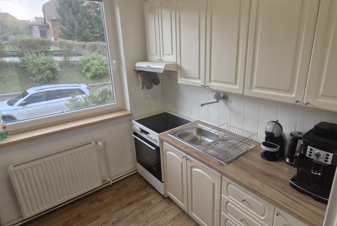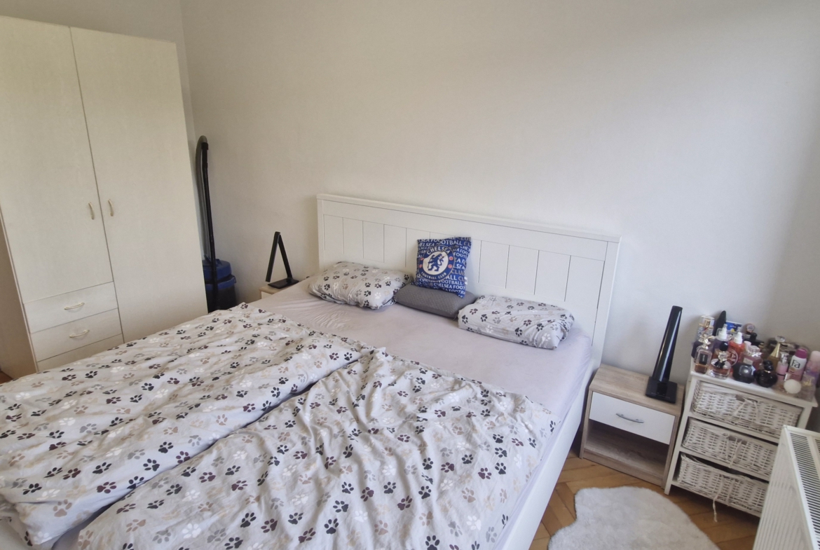 V ložnici je k dispozici manželská postel a prostorné úložné skříně. Obývací pokoj je vybaven sedací soupravou, jídelním stolem se židlemi, obývací stěnou a velkoformátovou televizí se sound barem, což poskytuje komfortní zázemí pro každodenní život i odpočinek. Kuchyně je vybavena všemi potřebnými spotřebiči, jako je lednice, trouba, digestoř, mikrovlnná trouba a sušička. Koupelna je vybavena vanou, toaleta je samostatná.